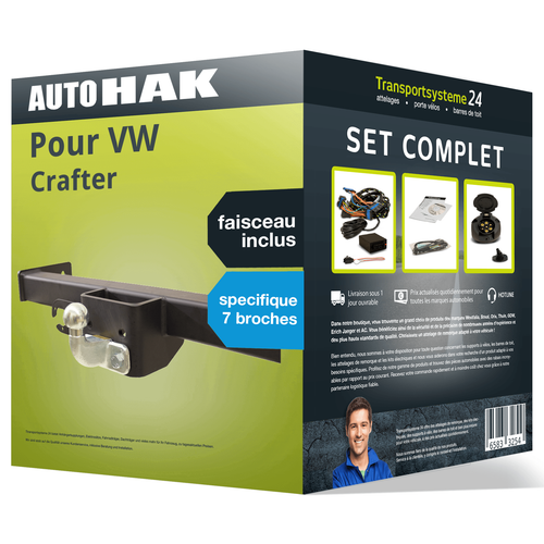 Pour tirer une remorque avec ton VW Crafter I (2006-2016), cet attelage est parfait ! Il est démontable, avec une boule rigide fixe, une force D de 17.2 kN, et une capacité de traction de 3500 kg. Inclus : le crochet, un faisceau électrique universel 7 broches (marque Quasar-Electronics), et un adaptateur. Homologué, neuf, garantie 2 ans. Pas besoin de découper le pare-chocs. Compatible CAN-BUS et LED. Si tu es artisan, transporteur, ou que tu utilises ton Crafter pour les loisirs, cet attelage est fiable et conforme. Installation recommandée par un professionnel. Un investissement pour étendre les capacités de ton véhicule utilitaire. Vérifie la compatibilité exacte avec ton modèle et année.